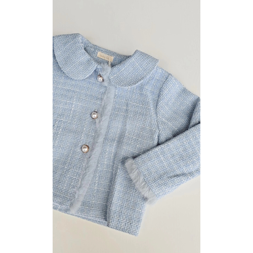 het jasje gaat dicht met 3 prachtige parelmoerknopen en aan de zijkant komt het schattige bontje randje terug