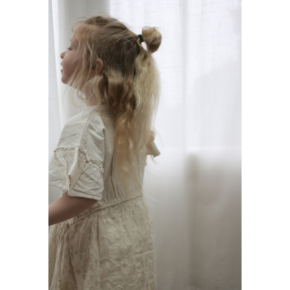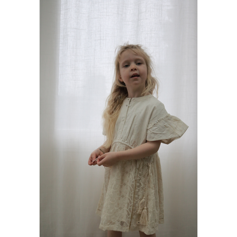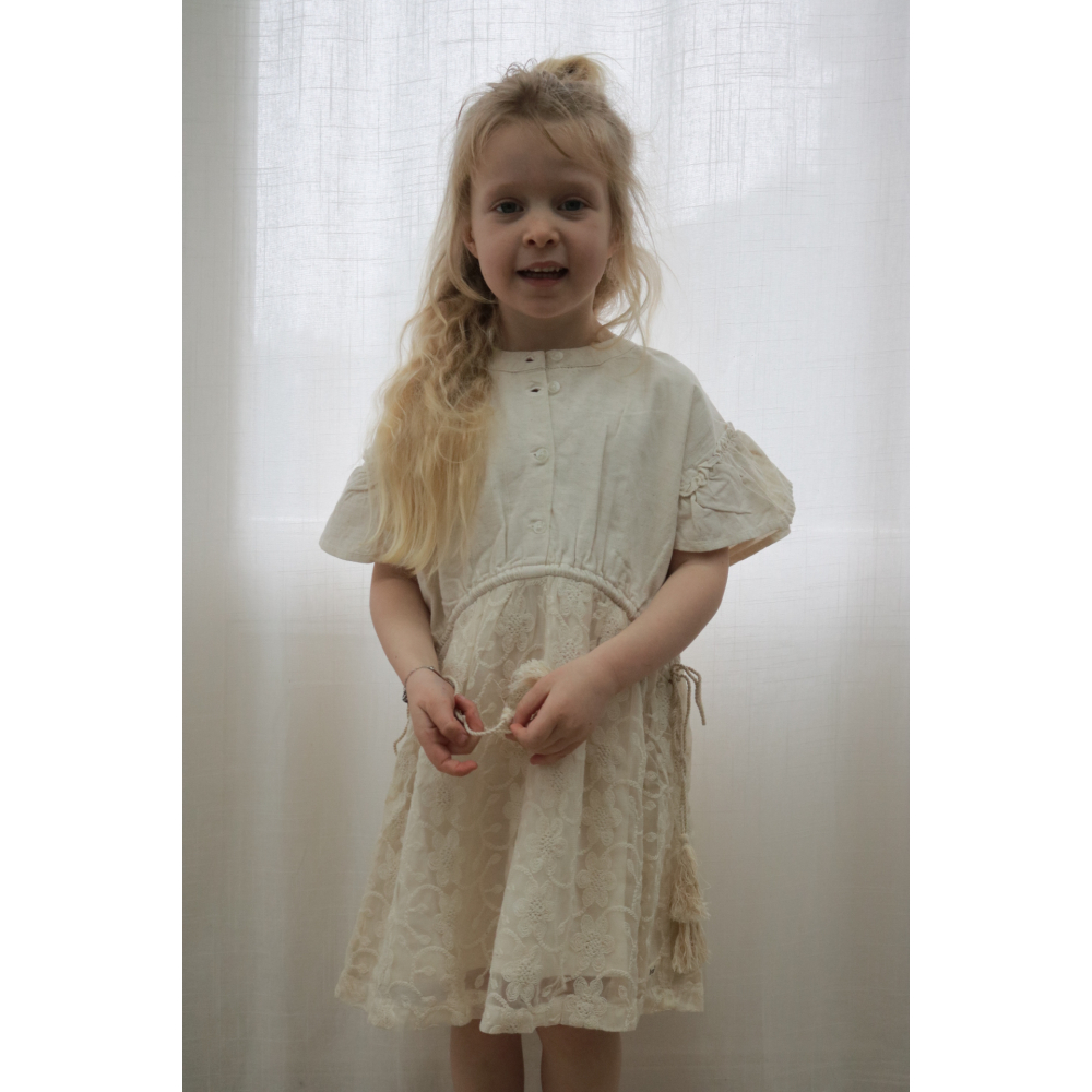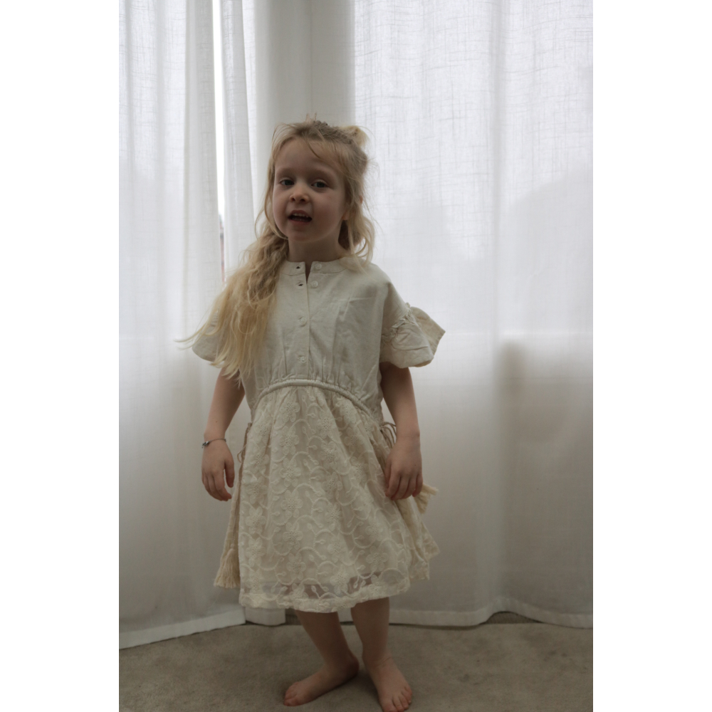 deze prachtige jurk in off white cobineert eenvoud met romantishe details.