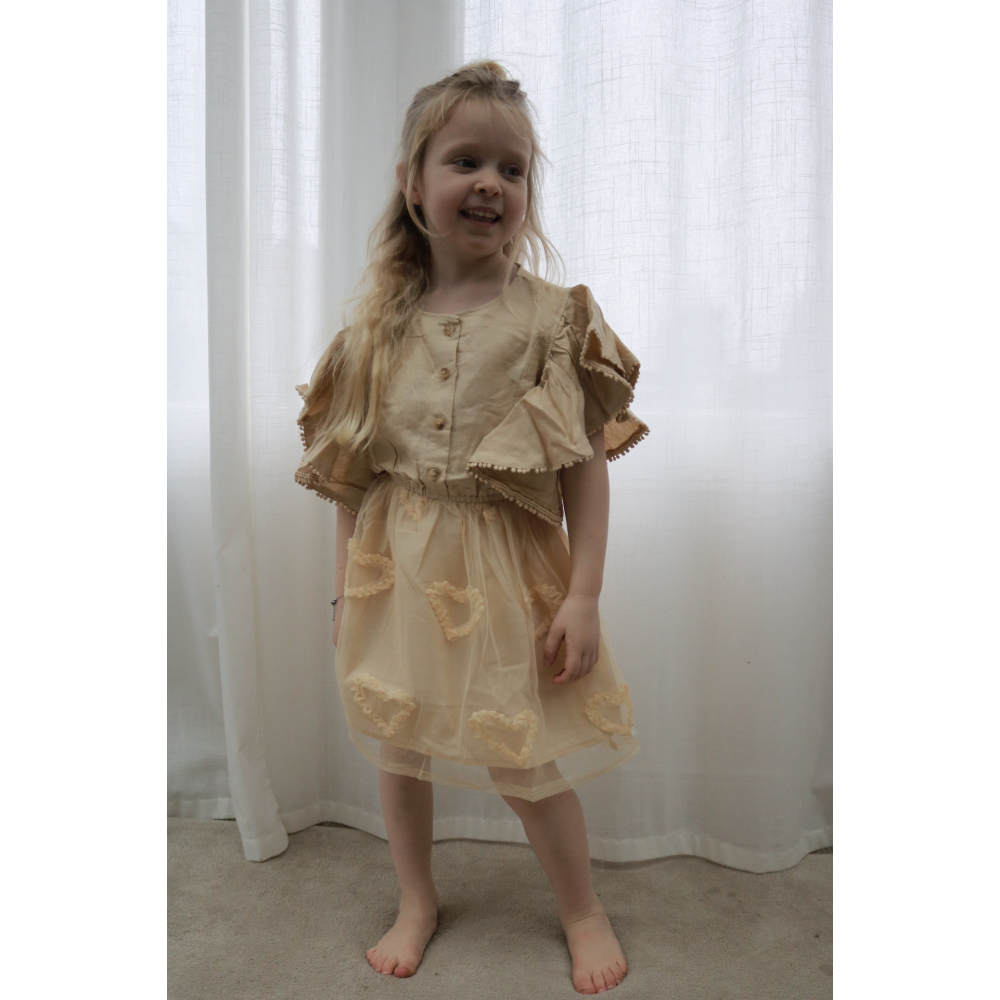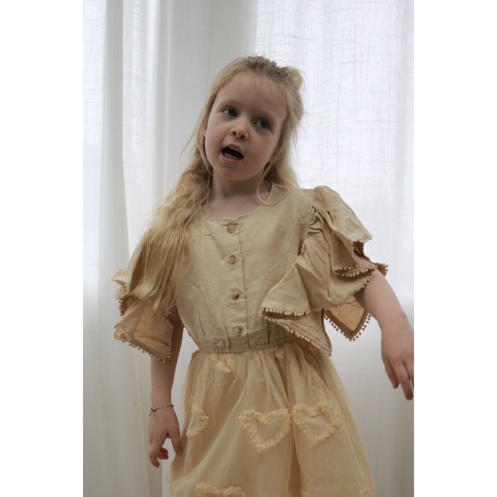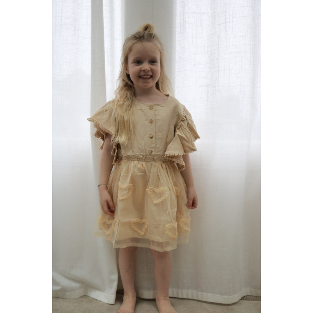 droom zachtjes weg in deze betoverende beige tule jurk met lieve uitgesneden hartjes. speelse pomponrandjes en luchtige fladder-mouwen isdit een jurk waar elk prinsesje zich als een fee voelt. perfecte jurk om te dragen bij iedere gelegenheid.