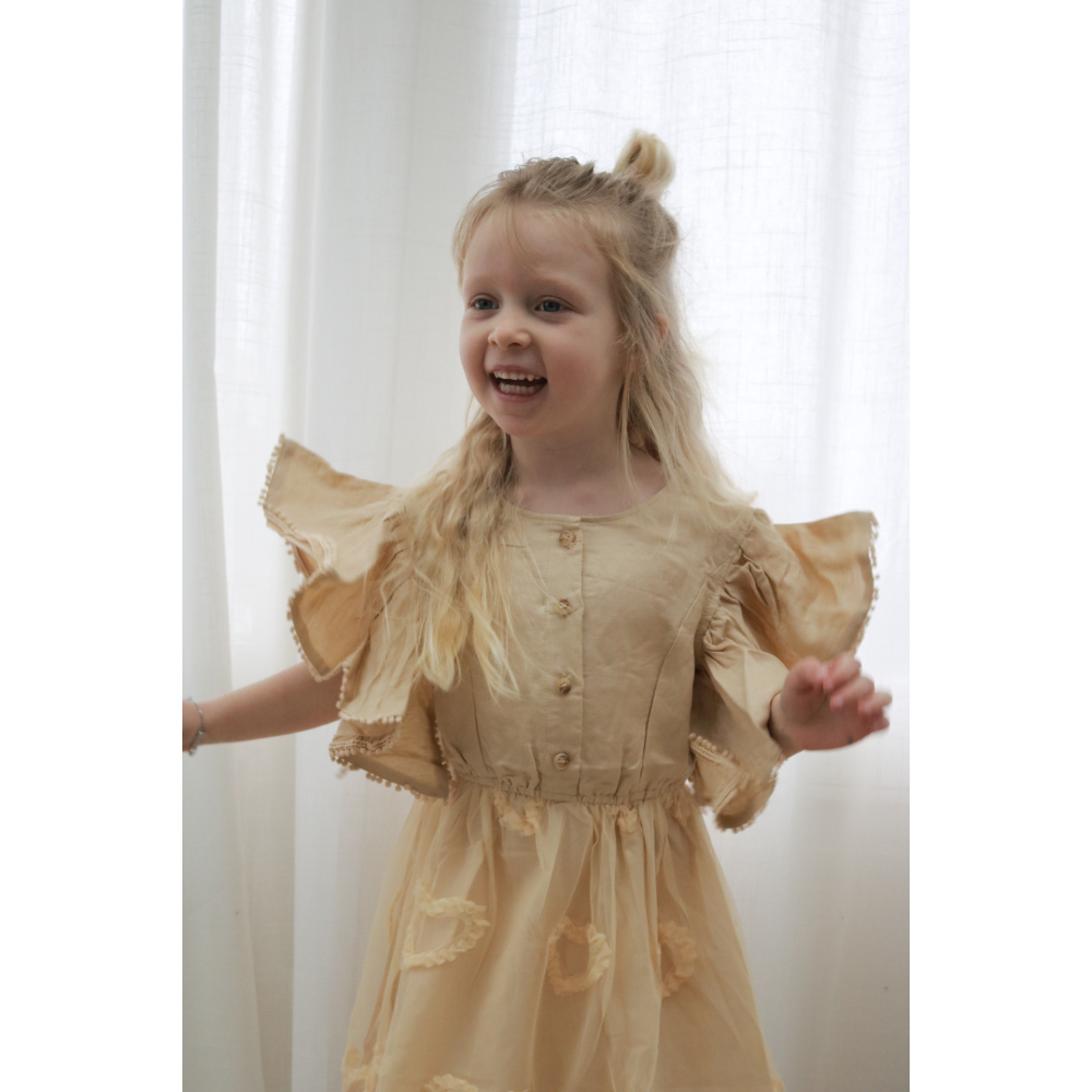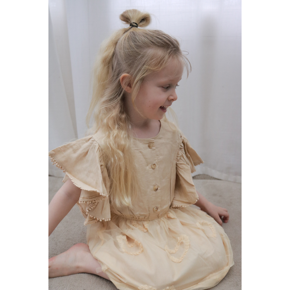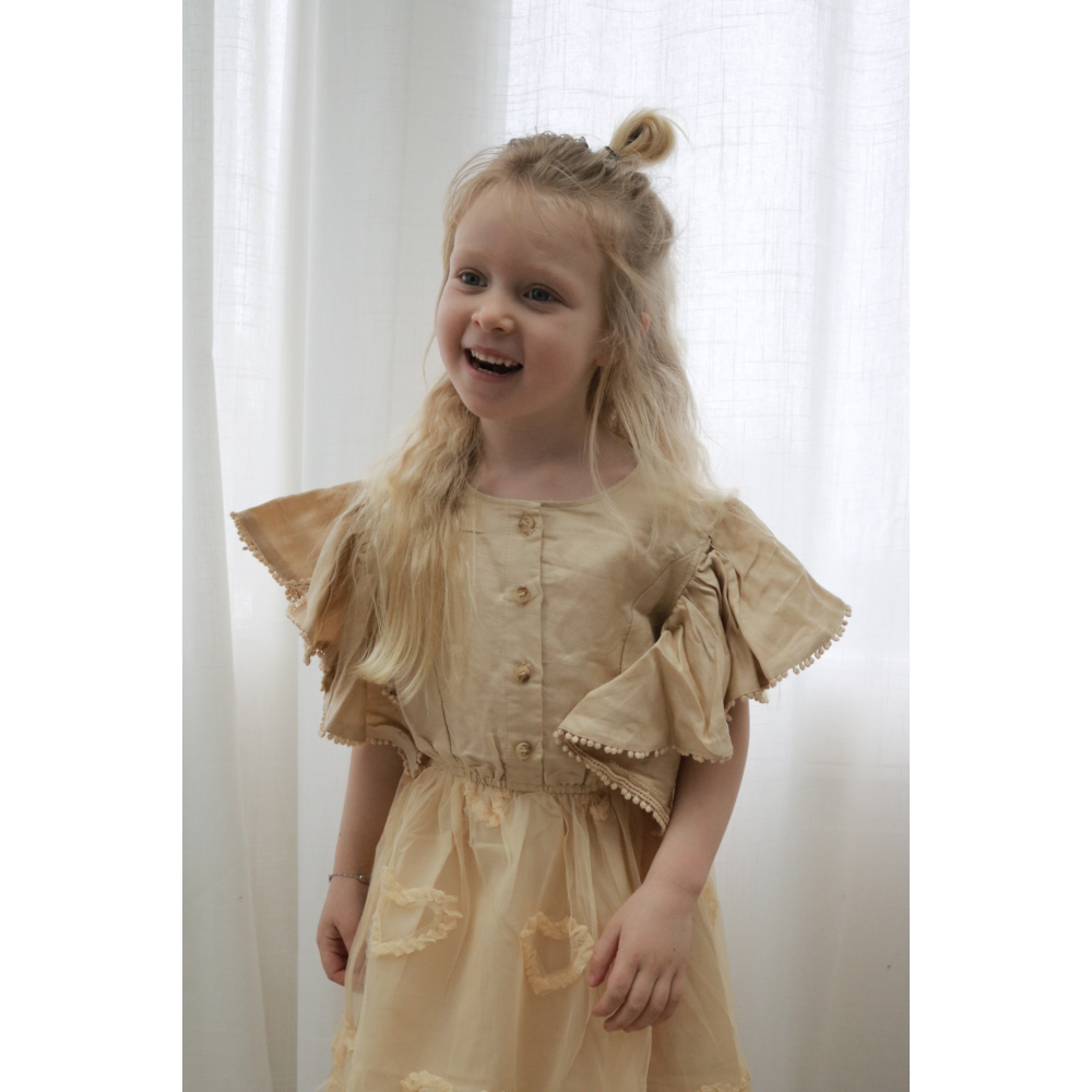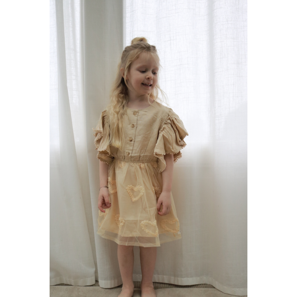 droom zachtjes weg in deze betoverende beige tule jurk met lieve uitgesneden hartjes. speelse pomponrandjes en luchtige fladder-mouwen isdit een jurk waar elk prinsesje zich als een fee voelt. perfecte jurk om te dragen bij iedere gelegenheid.
