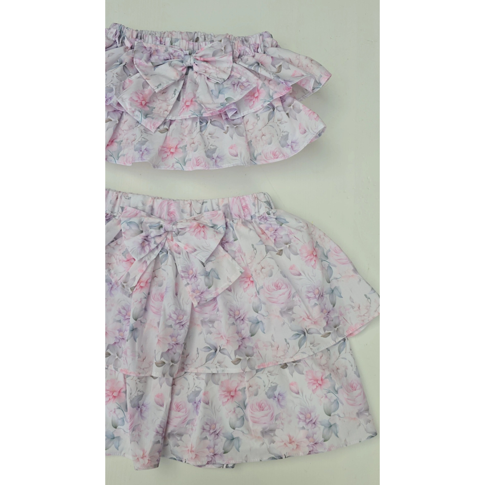 de verfijnde bloemenprint gecombineerd met speelse laagjes en een stijlvolle strik op de achterkant zorgen voor een romantische en tijdloze uitstraling.