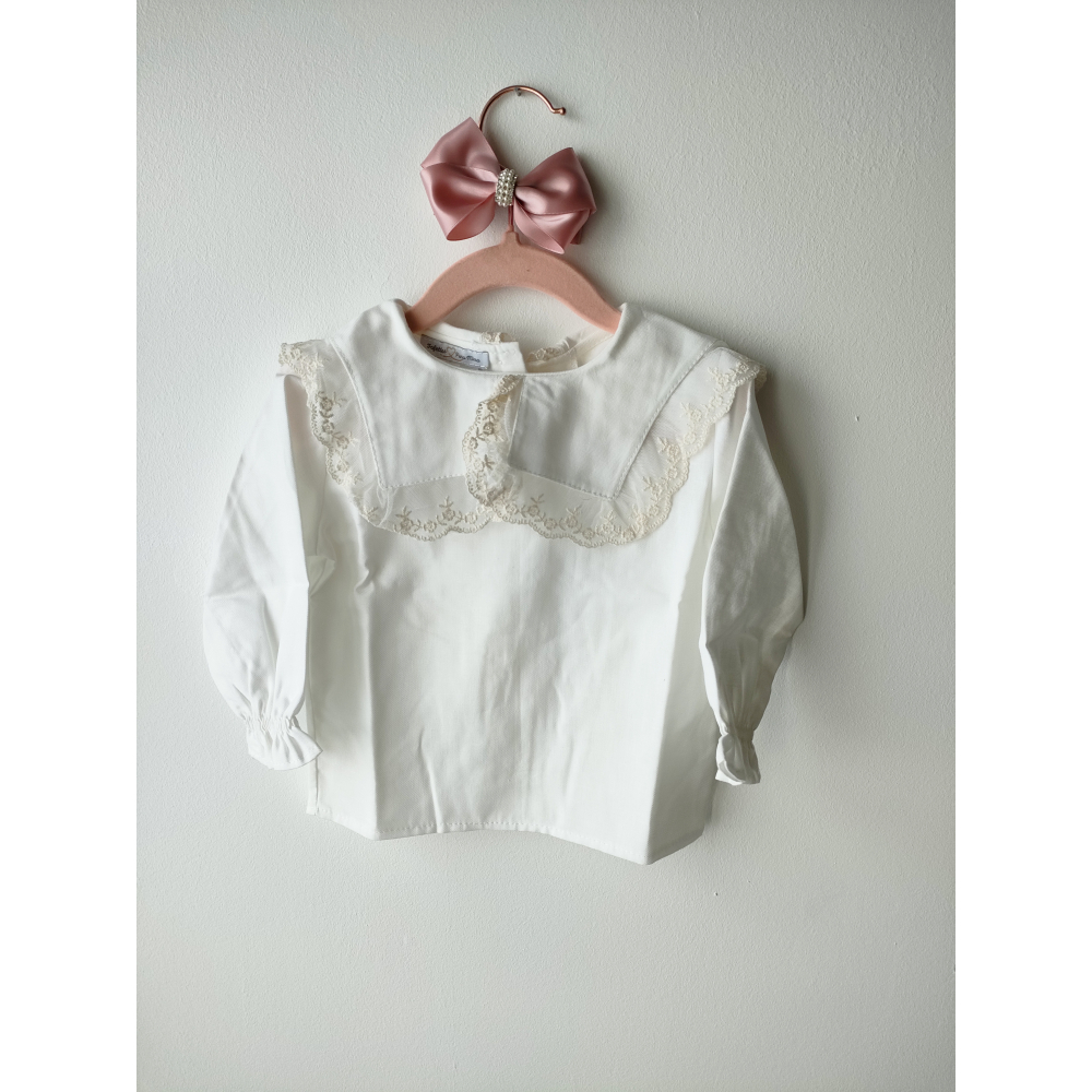 deze ivoor kleurige blous heeft een mooi kraagje die afgewert is met kant en mooi bloemenpatroon