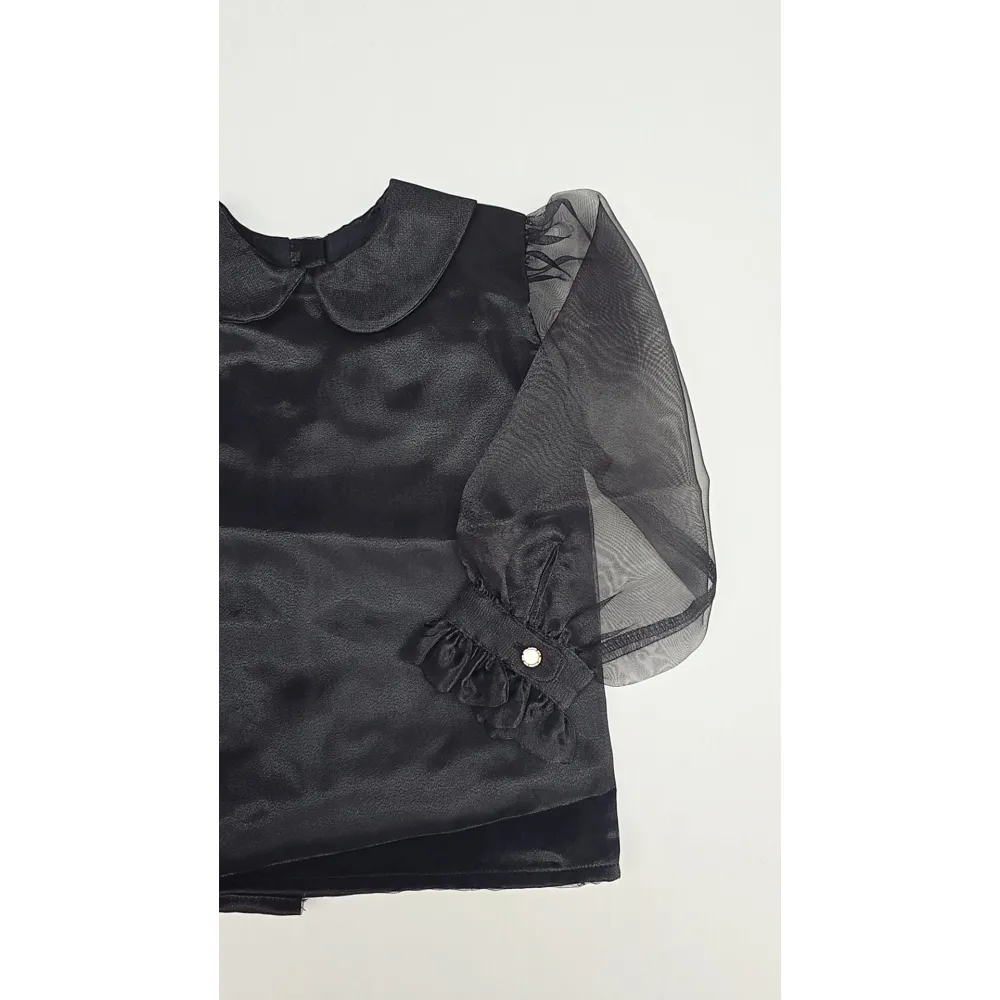 de mouwen zijn afgewerkt in zwarte tule dit maakt de blouse heel speciaal.