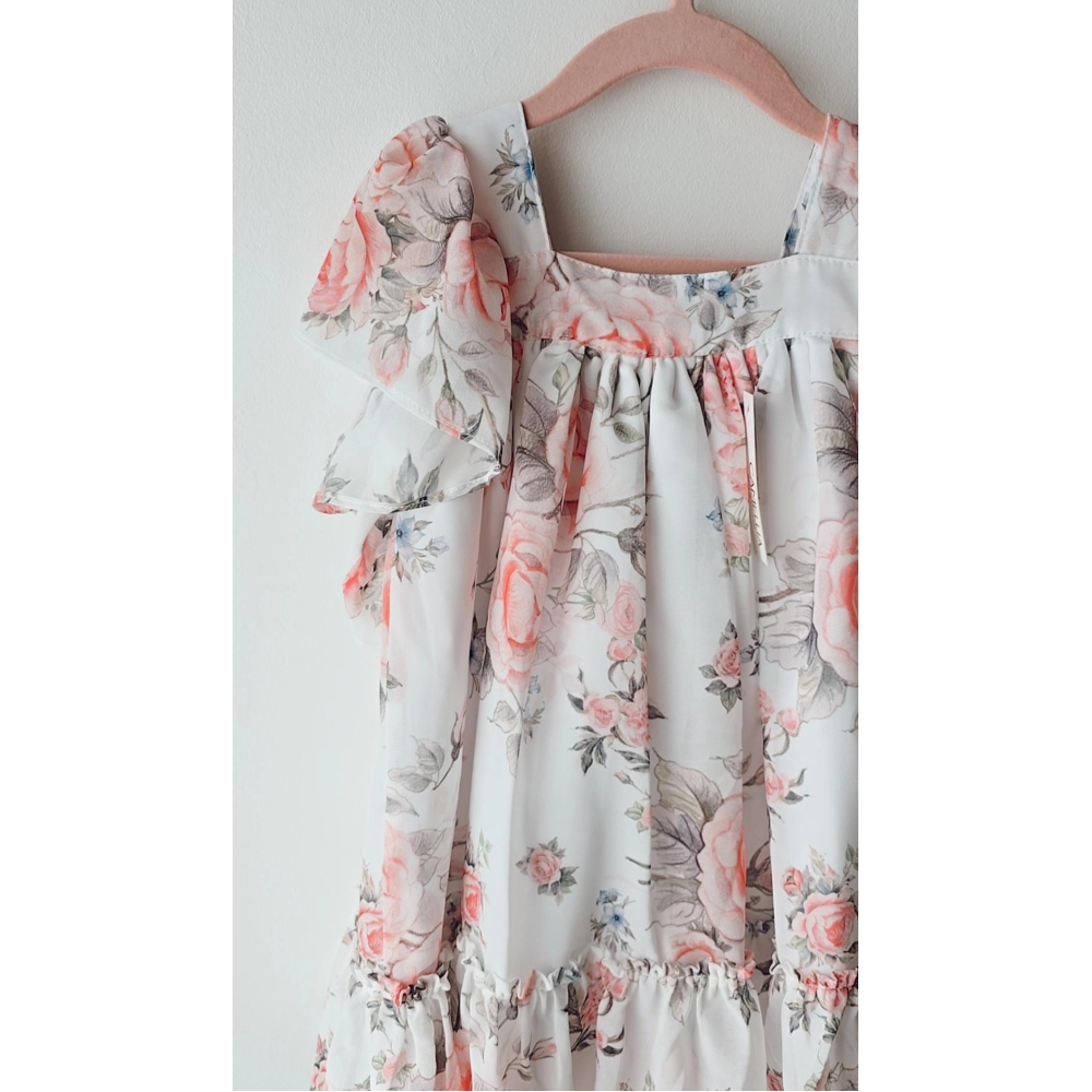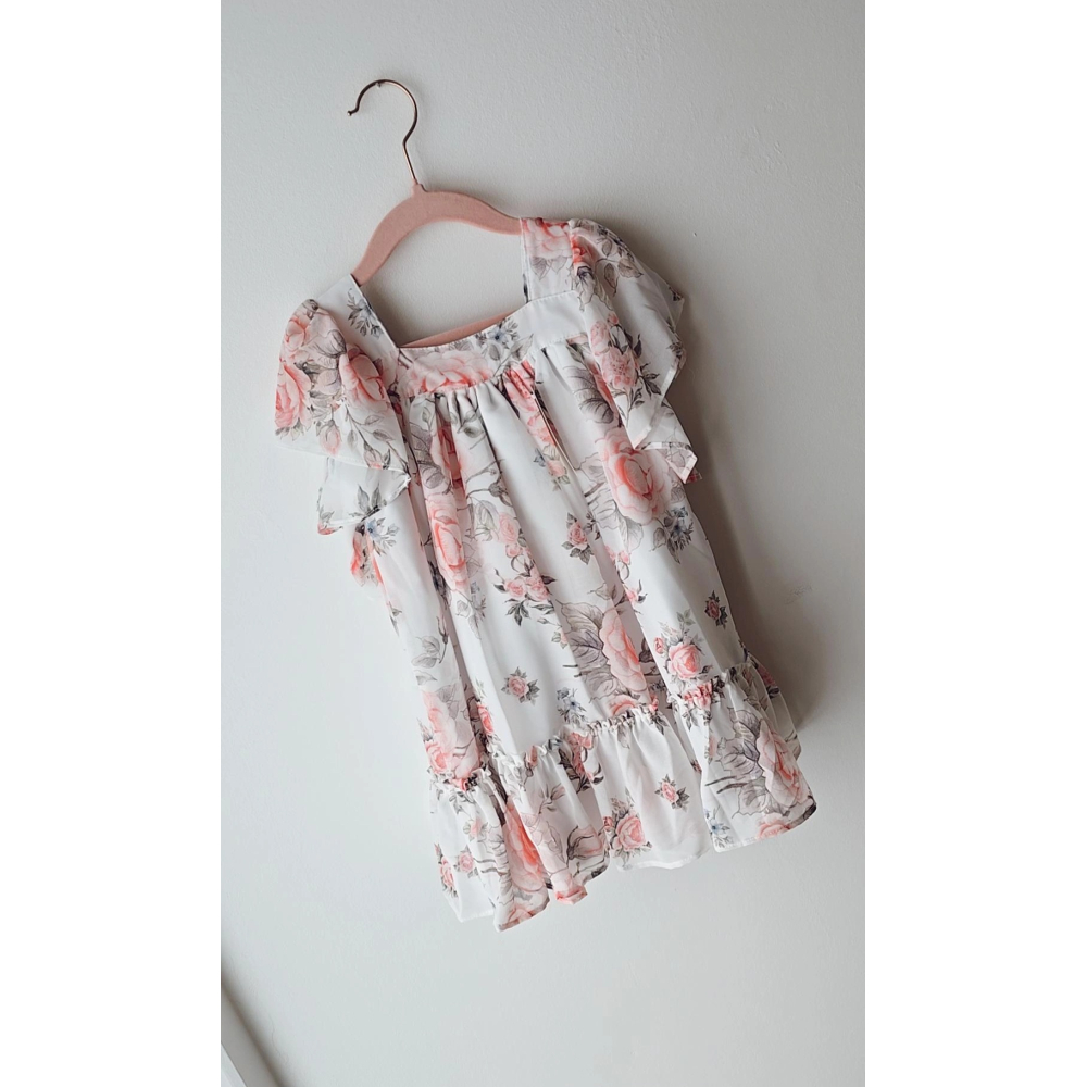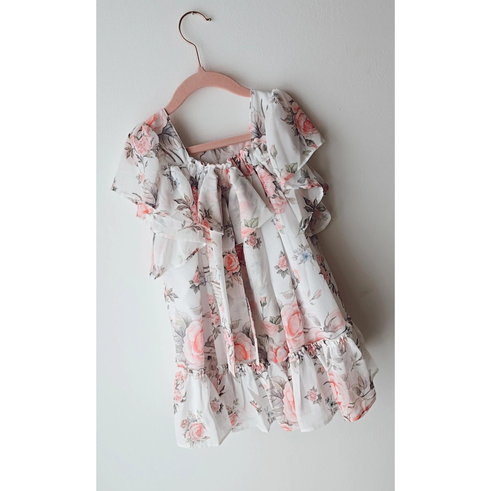 Elegante speelse jurk in.chiffon stof deze heeft ook leuke speelde mouwen. op de achterkant heeft deze een mooie strik een jurkje voor ieder prinsesje