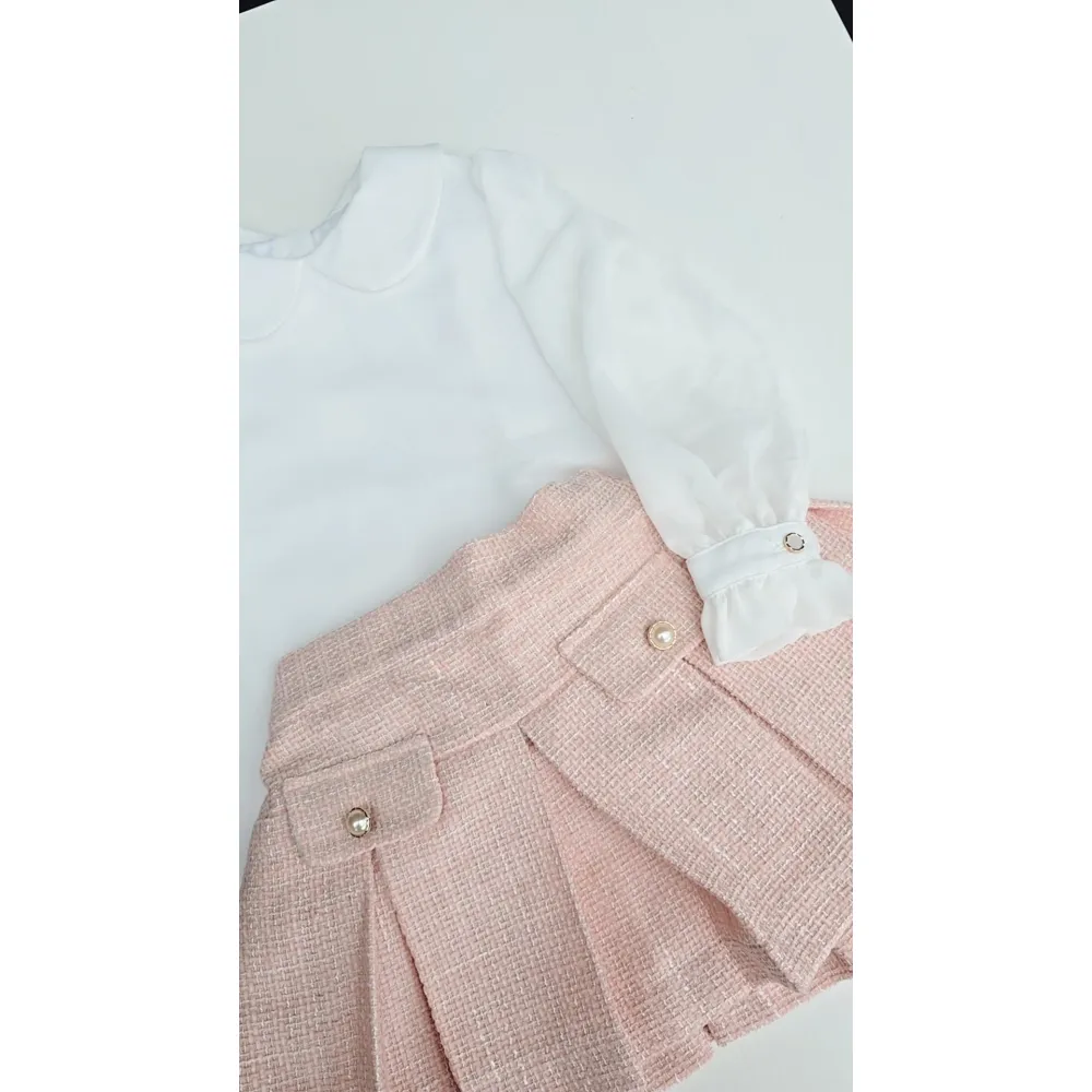 Roos rokje in tweed stof deze heeft 2 sier zakjes met een mooie knoop als afwerking met de speelse plooitjes kan je er echt leuk mee zwieren. Het rokje is ook aanpasbaar in de taille