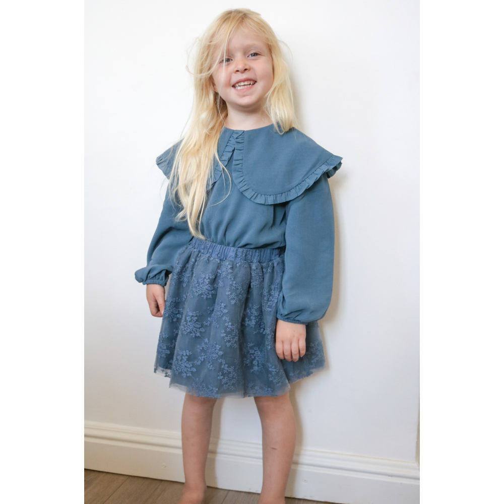 pracht tulle rok met een bloemenpatroon op geborduurd. werkelijk een prachtige rok prachtig om te vombineren met de lune top om het helemaal af te maken kan je deze combineren met de stabifoot boots merk- lrdl - kleur miriage blue - valt op maat