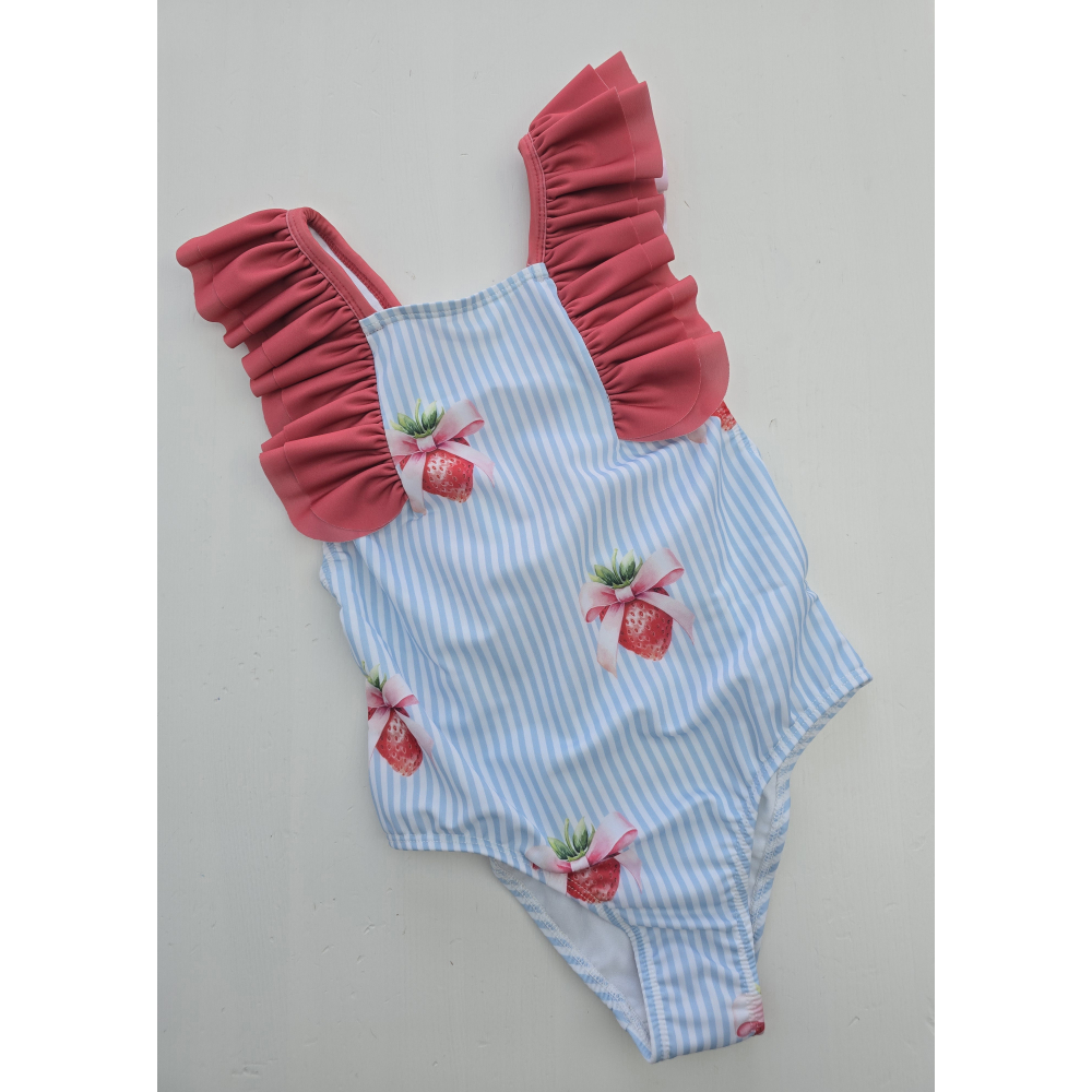 dit stijlvolle meisjesbadpak combineert frisse lichtblauwe streepjes met vrolijke aardbeienprints