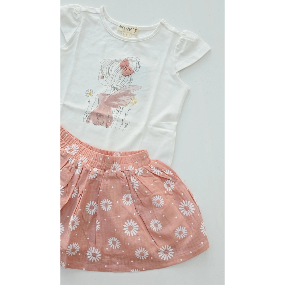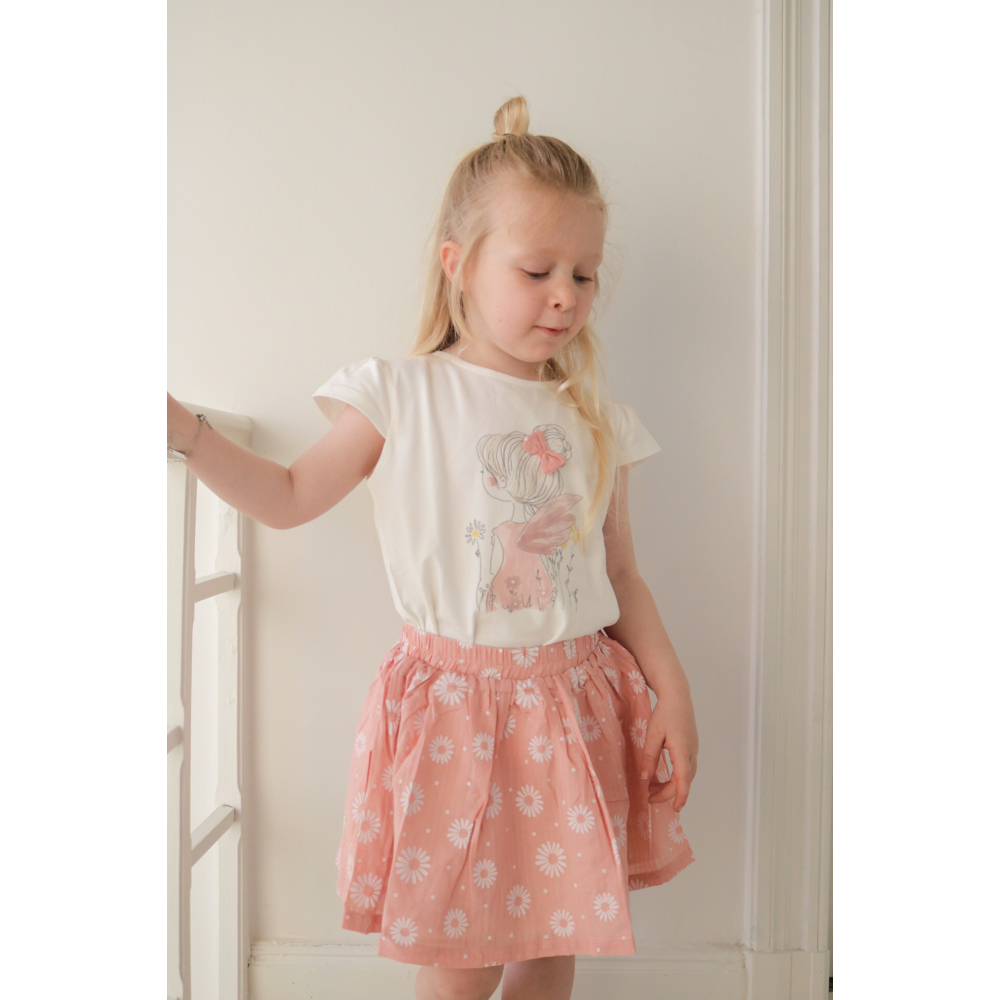 het is versierd met een vrolijke print van madeliefjes en kleine witte stipjes. wat zorgt voor een speelse uitstraling.