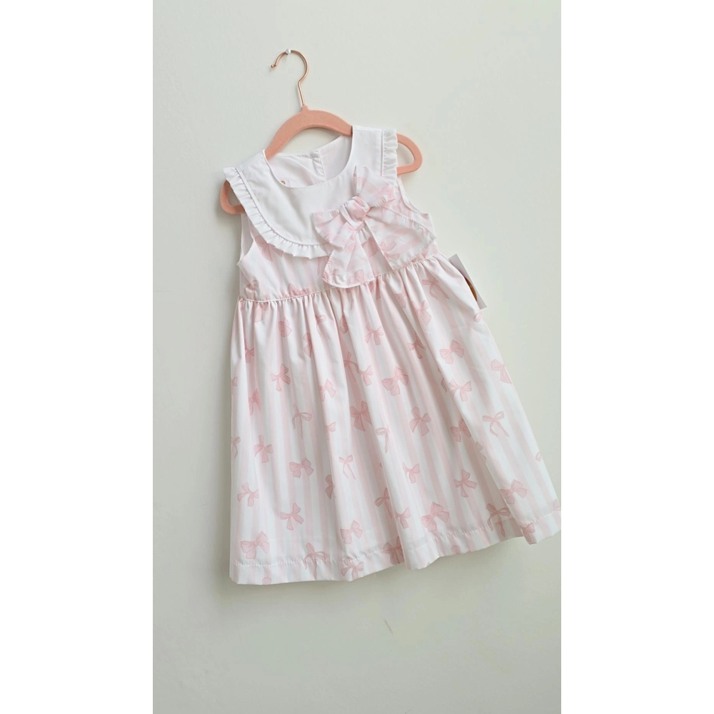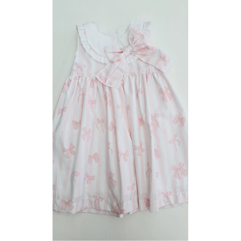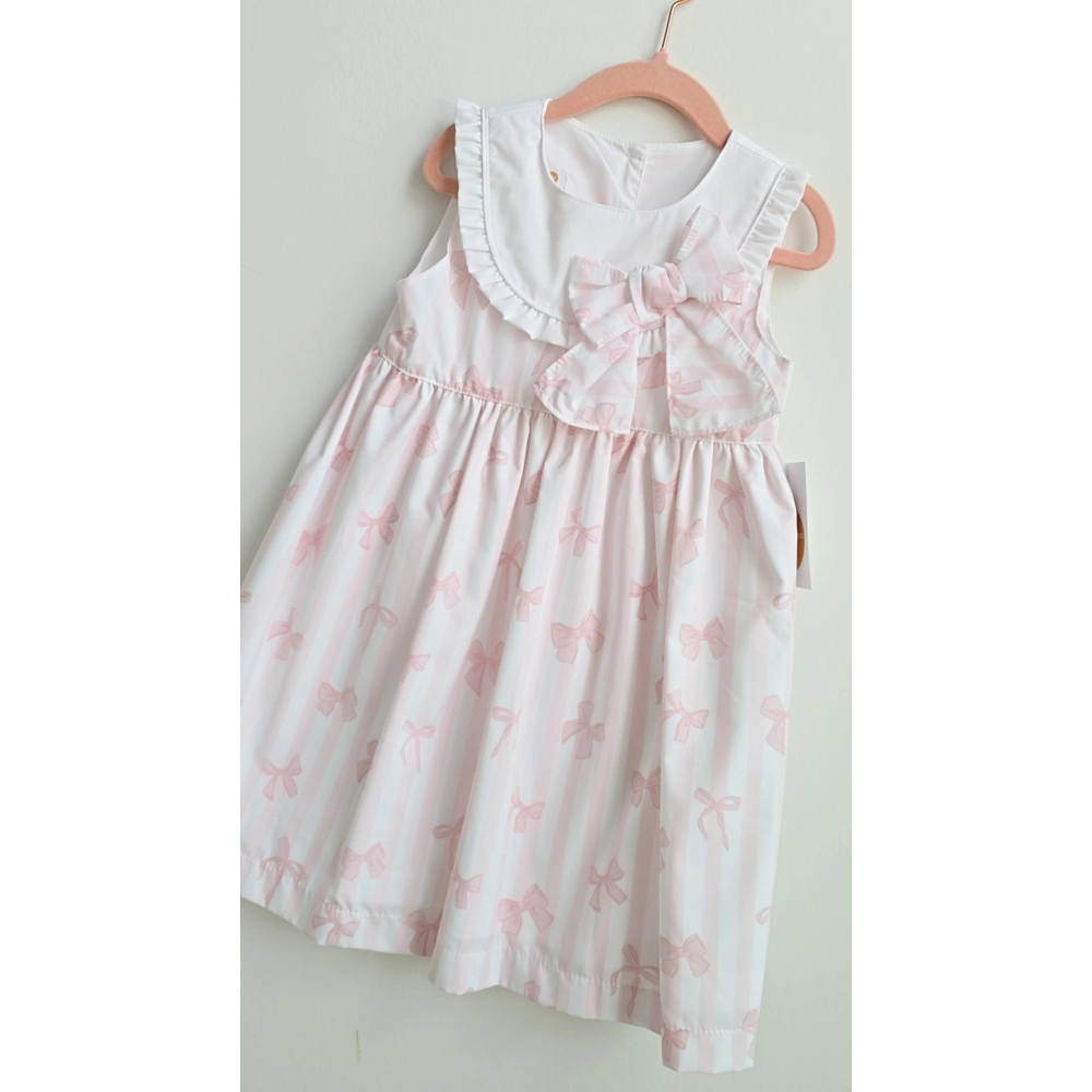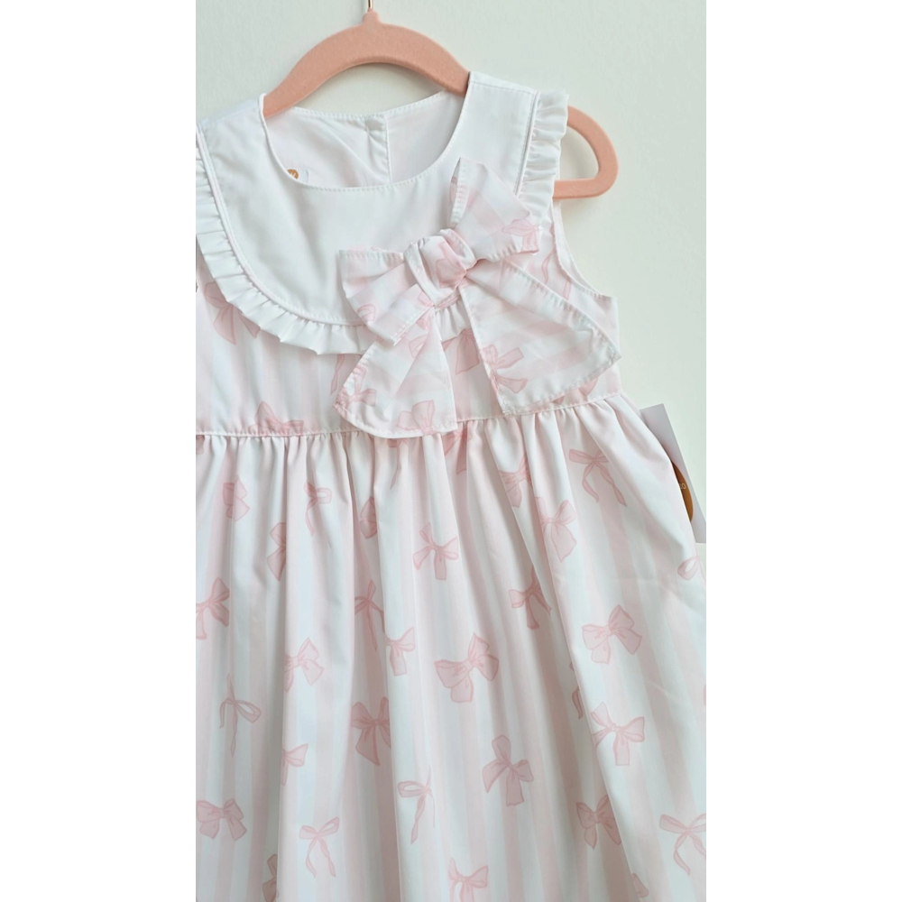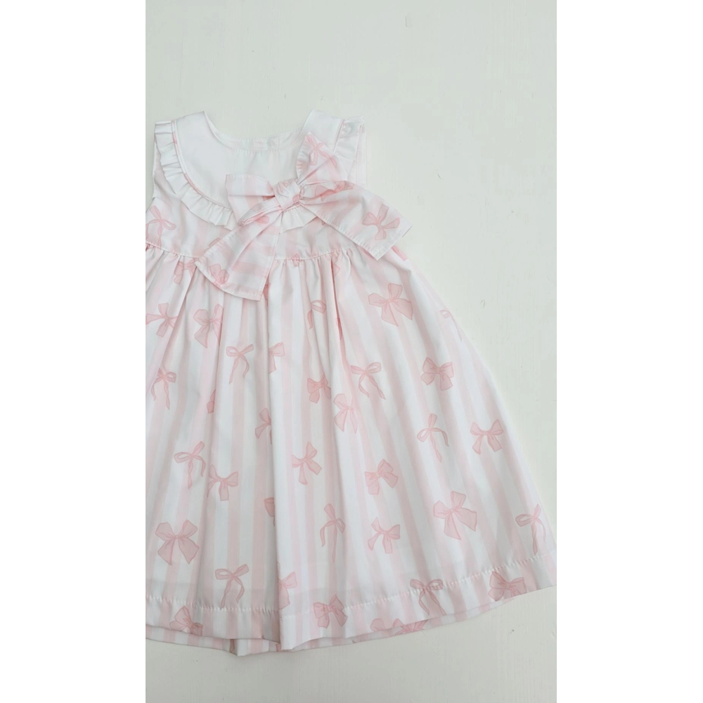 de subtiele streepjes gecombineerd met schattige strikjesprint geven het jurkje een lieve uitstraling