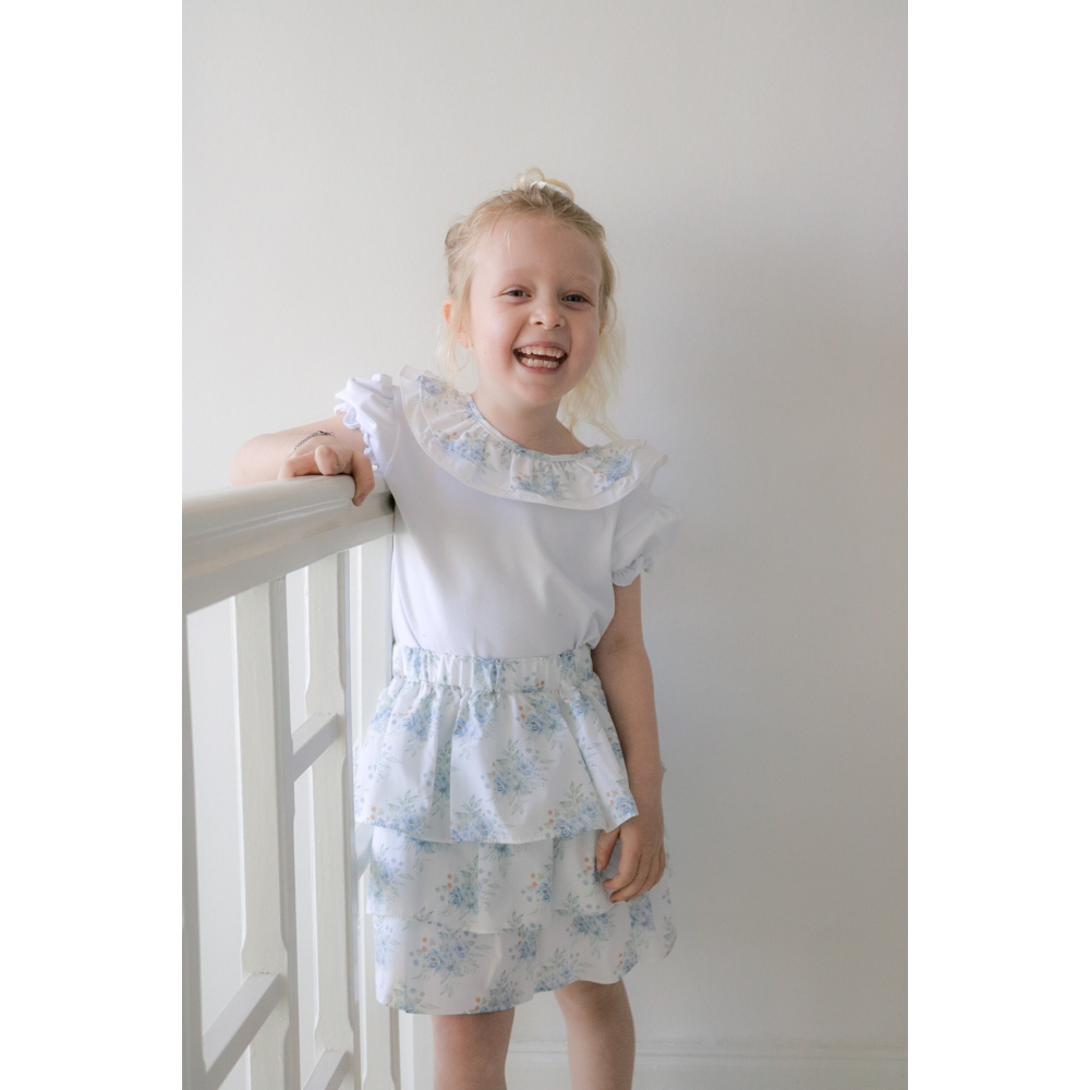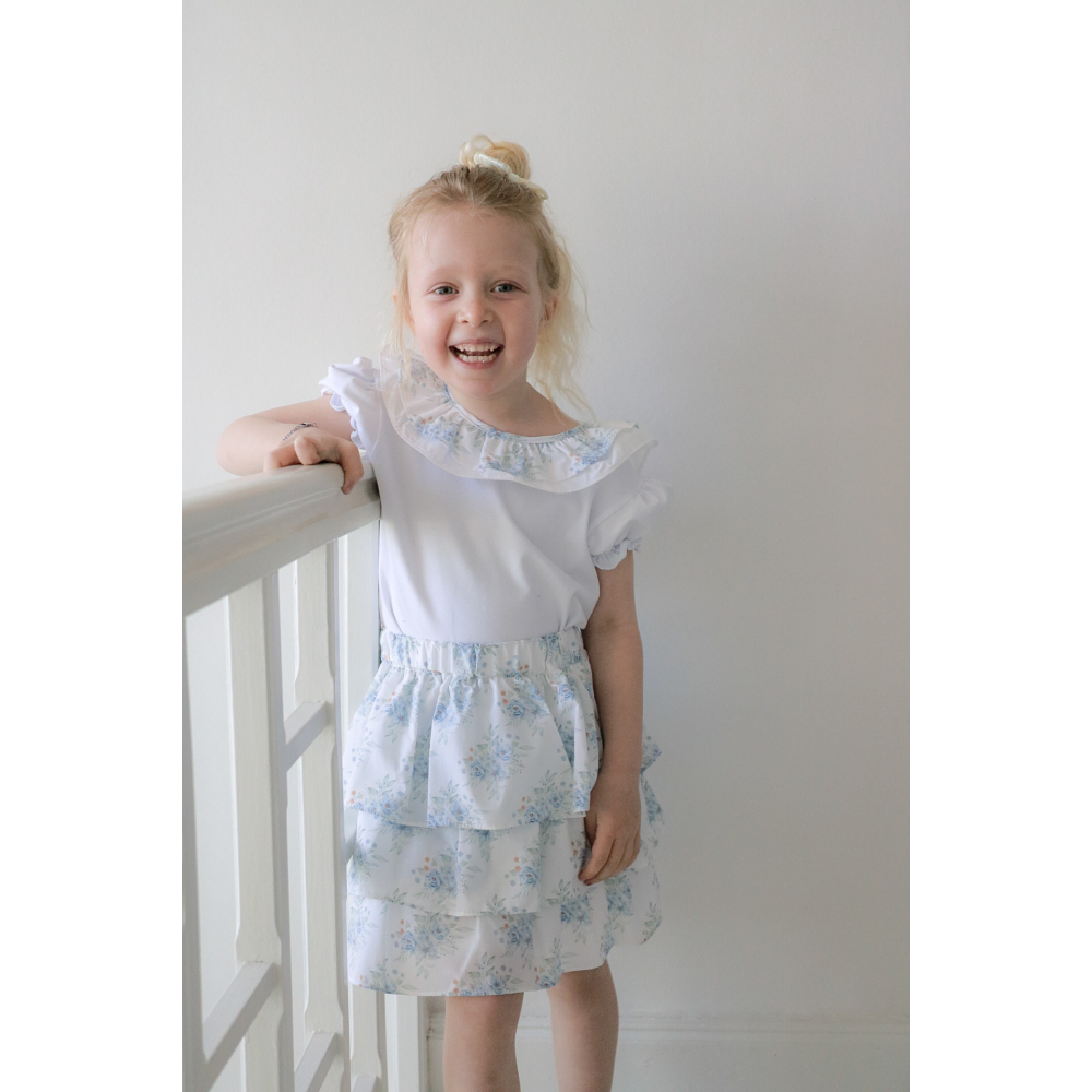 de subtiele bloemen in lichtbauw met zachte pastiltinten geven de rok een frisse lieve uitstraling